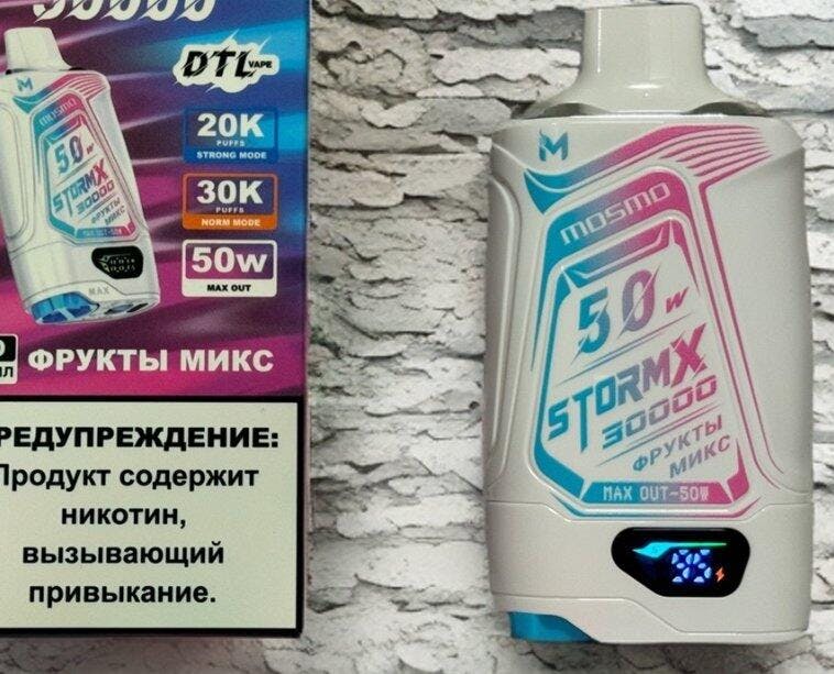 Mosmo Storm X 30000 Disposable Vape features a built-in rechargeable 1000mAh battery and is pre-filled with 30ml of e-juice. It offers approximately 30,000 puffs in NORM mode and 20,000 puffs in Strong mode. The storm x vape includes a brief smart display screen and utilizes 0.3ohm quad mesh coils designed for DTL vaping. This Mosmo Storm X provides a 2% (20mg) nicotine strength, catering to users who prefer a moderate nicotine level.