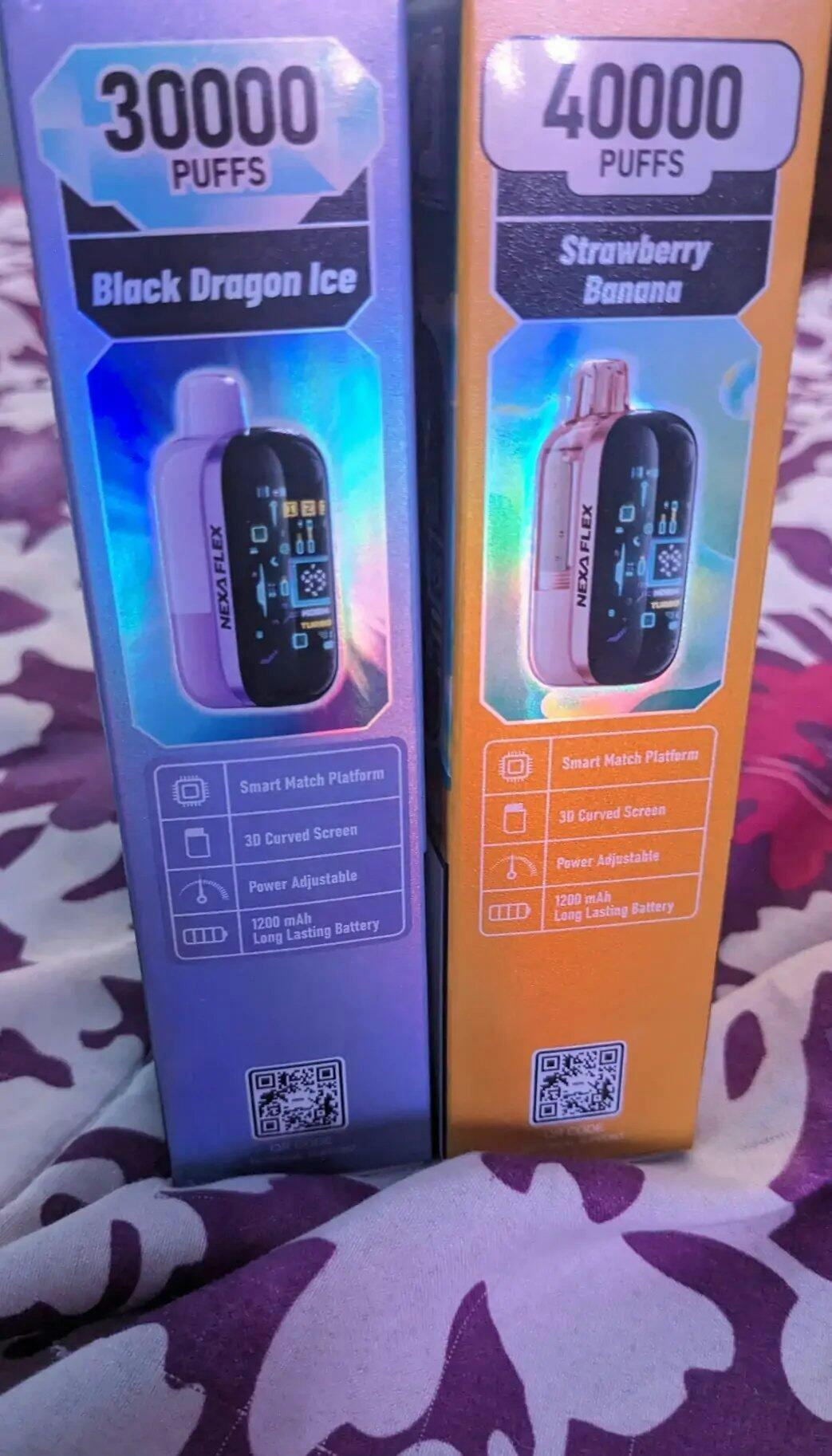 NEXA Flex comes in two versions, Ice Master with up to 30000 puffs and Flavor Booster with up to 40000 puffs. The Cool Pod delivers about 30000 puffs in Norm mode or 18000 in Turbo, while the Visible Pod offers around 40000 in Norm and 25000 in Turbo. The Ice Master version features four adjustable ice levels, and the Flavor Booster version uses a patented transparent pod. Powered by a rechargeable 1200mAh battery and holding 18ml of pre-filled e-juice, it includes an intelligent side screen with dark and light modes to display battery and output settings, supporting both Norm and Turbo modes for flexible use.