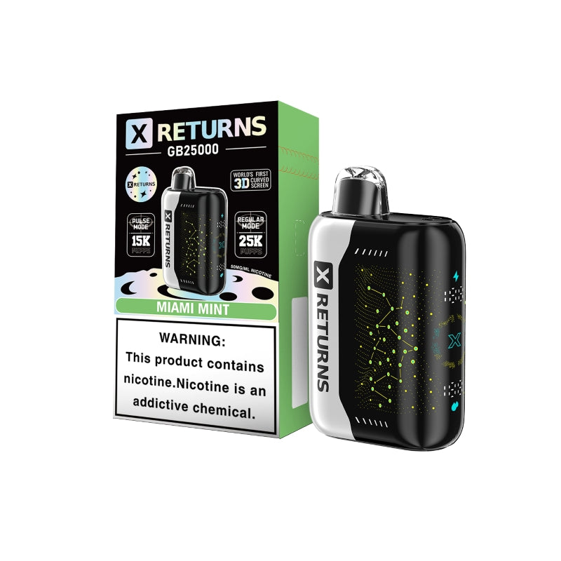 X Returns GB25000 is a disposable vape with an 820mAh internal rechargeable battery, 18ml of vape juice, and adjustable modes. Equipped with dual mesh coils, the vape provides consistent flavor no matter how many puffs you vape. It comes with two output modes: the regular mode provides a common vaping experience, while the pulse mode offers an enhanced flavor and denser vapor. The prefilled liquid provides 15000 puffs under the pulse mode and 25000 puffs under the regular mode. The airflow adjustment allows you to customize according to your habits. Last but not least, the color screen makes it easy for you to check the e-liquid level, mode status, and battery life. Grab this X Returns GB25000 Disposable Vape for upgraded vaping.
